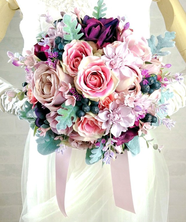 モーブピンクやワインカラーの大輪の薔薇をメインに、青みがかったパープルピンク・ニュアンスカラーの薔薇やミニバラ、人気のミニダリアなどに、シルバーグレーの葉を添え、ブラックベリーの実をアクセントしたアンティークな表情のラウンドブーケです。シックエレガントで、格上花嫁様に!