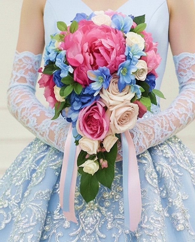 濃いピンクの存在感のある芍薬をメイン花材に、薔薇、ブルー系の小花のグラデーションが華やかなティアドロップブーケです。ドレスには、もちろん和装用との2WAYブーケにもいかがでしょうか?