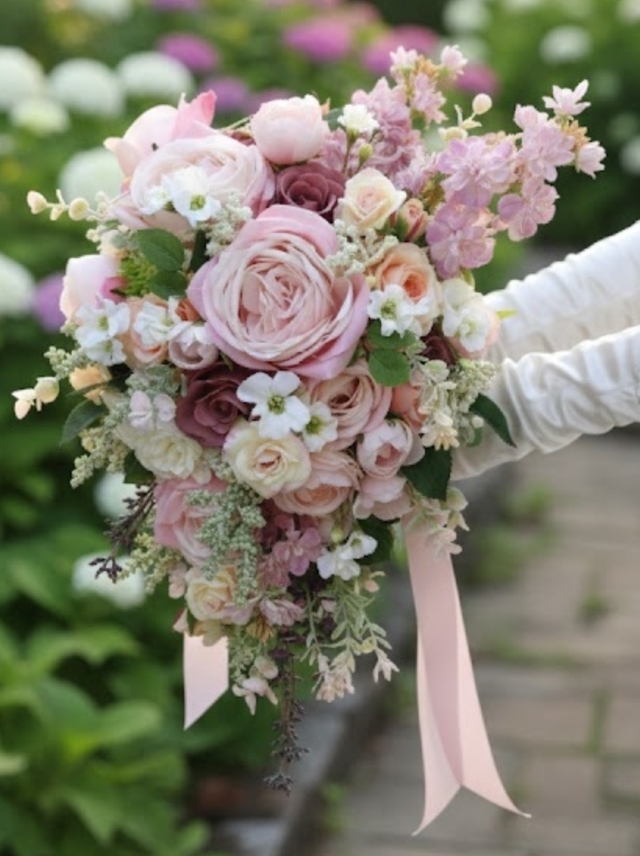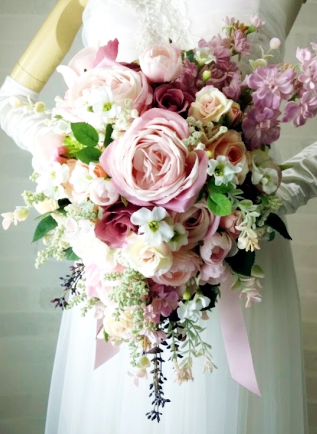 ほんのり淡いペールピンク、ピーチ、クリームピンク、モーブカラーに白い小花を散りばめ。スモ―キーカラーのグリーン類をあしらった、上品カラーのショートキャスケードブーケです。カラードレスにも、ウェディングドレスにも2WAY使用して頂ける大人ピンクのエレガントなブーケ