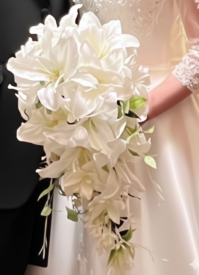 | 参考商品名 | カサブランカ・蘭・ジャスミンのボリュミィーなロングキャスケードブーケ |