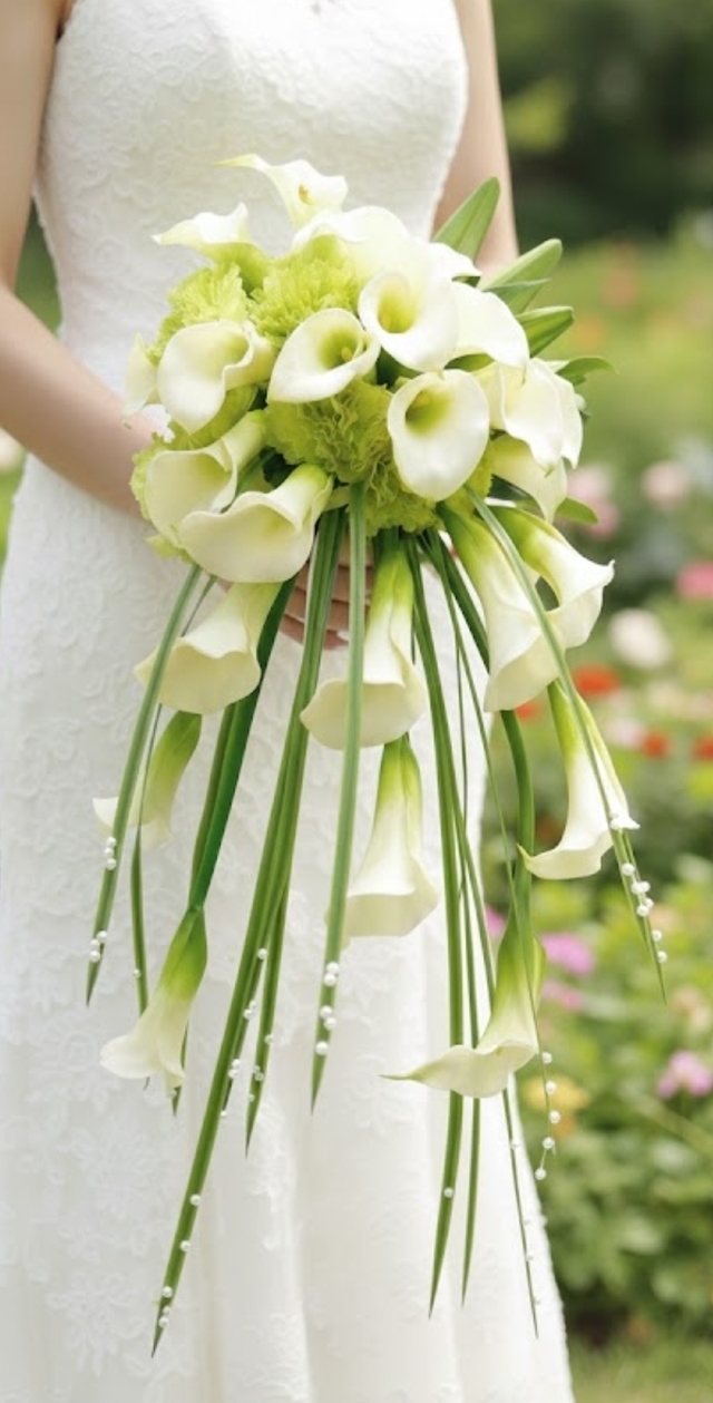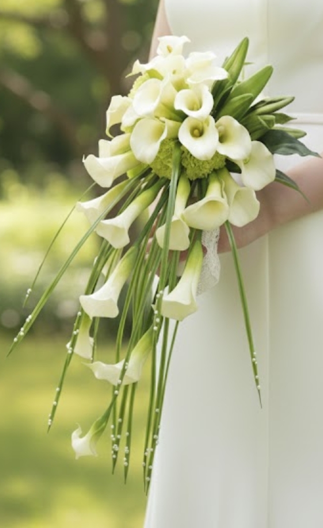 カラーの花を、シャワーにみたて、ラインを活かしたブーケです。ミスカンサスのグリーンの先端に、小粒のパールをあしらっています。シンプルながらも存在感のある、個性的なブーケをお探しの花嫁さまにいかがでしょうか?