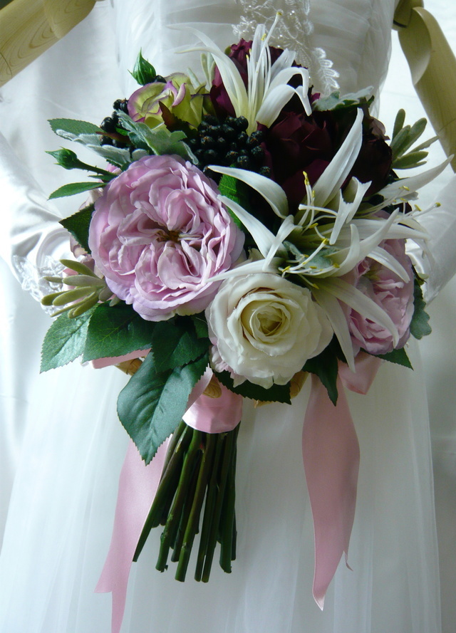 ラベンダーピンクとボルドー色の大輪の薔薇をメインに、実の物をあしらったラグジュアリー感漂う、ウエディング雑誌でも人気のナチュラルな、茎を活かしたデザインのクラッチブーケです。