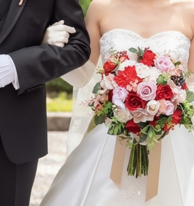 | 参考商品名 | レッド・ホワイト・モーブピンクの薔薇の大人エレガントなクラッチブーケ |