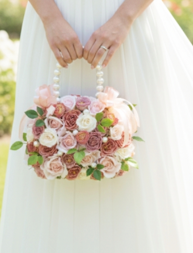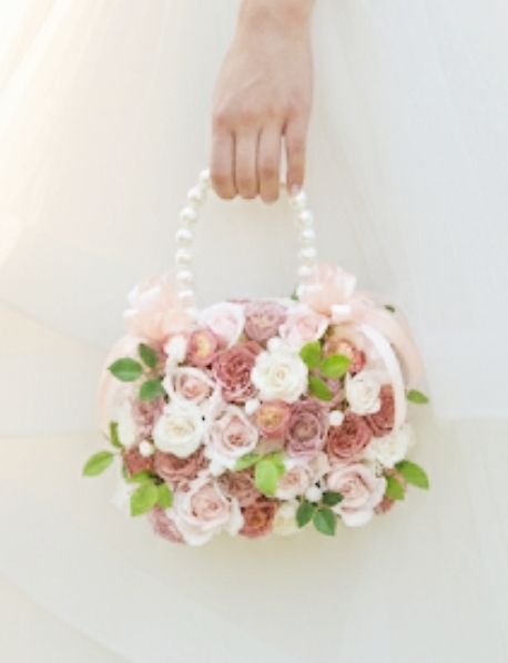 ソフトピンクや白系の薔薇やミニバラに、パールを散りばめた、愛らしいお姫様カラーのハンドバッグブーケです。