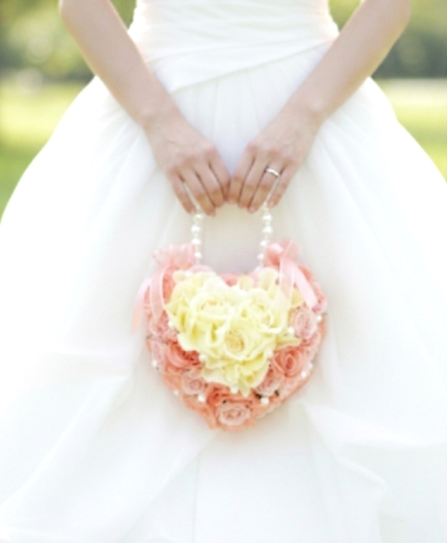ソフトイエローの薔薇で中心にハートをかたどり、周囲をソフトオレンジやサーモンピンクのパステルカラーの薔薇とパールをあしらった、優しい表情のなかにも個性のあるハートの形のバッグブーケです。
