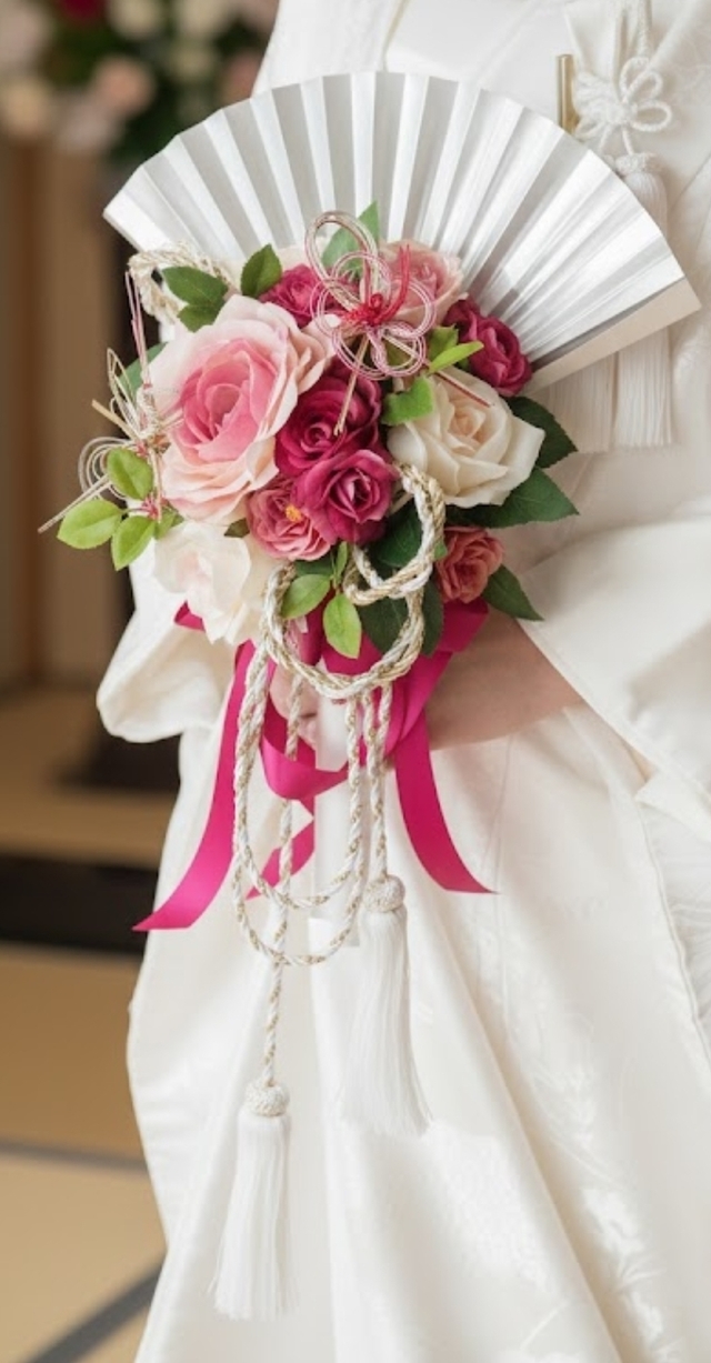 | 主な使用花材 | 薔薇、ミニバラ、和の小物(水引・組紐・タッセル)グリーン類、リボン |