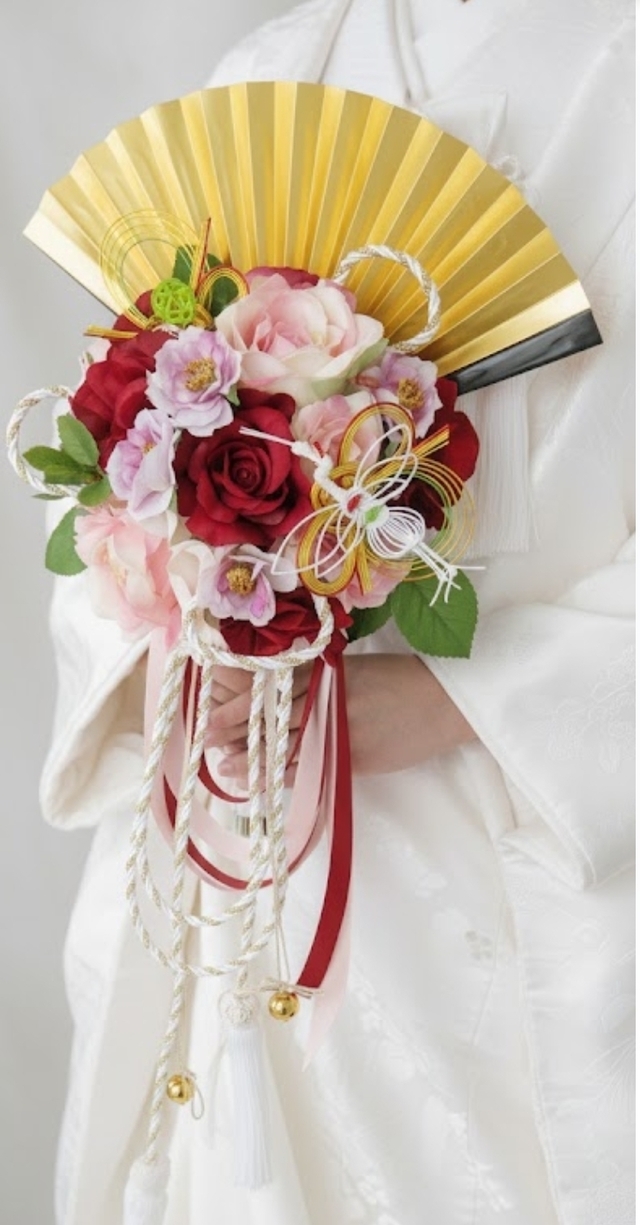 | 参考商品名 | 赤&ソフトピンク&ラベンダー色の薔薇の金扇の和装ブーケ |
