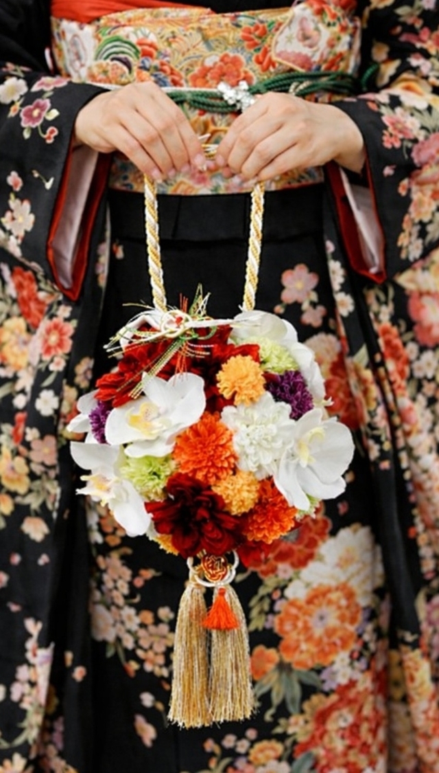 和装用ブーケでは、既に定番になっている、愛らしい形のボールブーケです。