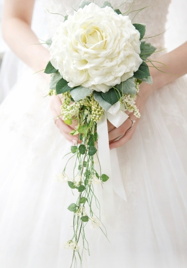 薔薇の白い花びらを重ね、グリーンで縦のラインを出した、エレガントなグランメリアブーケです。メリアのお花のまわりを、シルバーグリーンの葉と薔薇のグリーンの葉で囲み、大人エレガンスな印象に仕上げました。