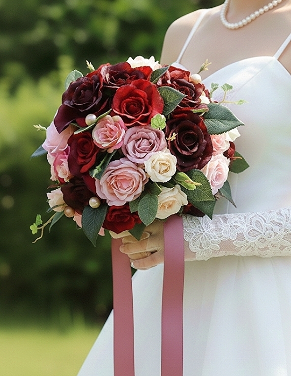 シックなワインカラー&真紅の薔薇に、優しいソフトピンクの薔薇をあしらい、パールを散りばめた大人エレガントなラウンドブーケです。赤やワインカラー、ニュアンスカラーのドレスにもよく似合う、落ち着いたなかにも華やかで上品なお色あいのブーケです。