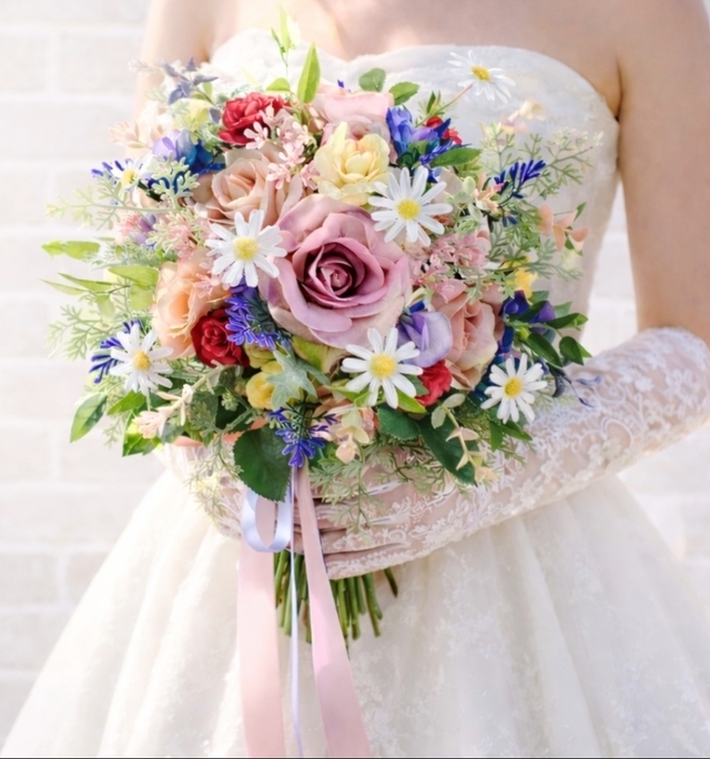 甘すぎない大人ピンクにソフトオレンジの薔薇や、華やかなローズ色・レモンイエローのミニ薔薇、パープルの小花やシルバーグレーの葉をあしらい、可憐なマーガレットでアクセントをつけた、海外のウエディング雑誌でも人気の、茎を活かしたデザインのクラッチブーケです。甘すぎる雰囲気はちょっと苦手という花嫁様にも、大人のパステルカラーは品良くお持ち頂けます。